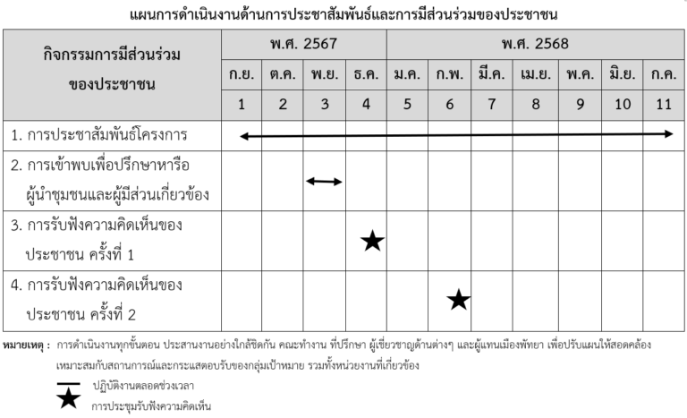 การมีส่วนร่วมของประชาชน จัดการประชาสัมพันธ์โครงการ การรับฟังความคิดเห็นและการมีส่วนร่วมของประชาชนตามระเบียบสำนักนายกรัฐมนตรีว่าด้วยการรับฟังความเห็นของประชาชน พ.ศ.2548 และแนวทางการมีส่วนร่วมของประชาชนในกระบวนการจัดทำรายงานการประเมินผลกระทบสิ่งแวดล้อม สำนักงานนโยบายและแผนทรัพยากรธรรมชาติและ สิ่งแวดล้อม พ.ศ. 2566 เพื่อทราบถึงการดำเนินโครงการและเกิดความเข้าใจตรงกัน เพื่อให้ผู้มีส่วนร่วมในทุกระดับ โดยเฉพาะประชาชนในเขตพื้นที่โครงการให้ได้รับข้อมูลข่าวสารที่ถูกต้องและมีส่วนร่วมในการให้ข้อคิดเห็นหรือข้อเสนอแนะอันเป็นประโยชน์ สอดคล้องกับความต้องการของทุกฝ่าย โดยจะต้องจัดให้มีการประชุมเพื่อรับฟังความคิดเห็นของประชาชนอย่างน้อย 2 ครั้ง
